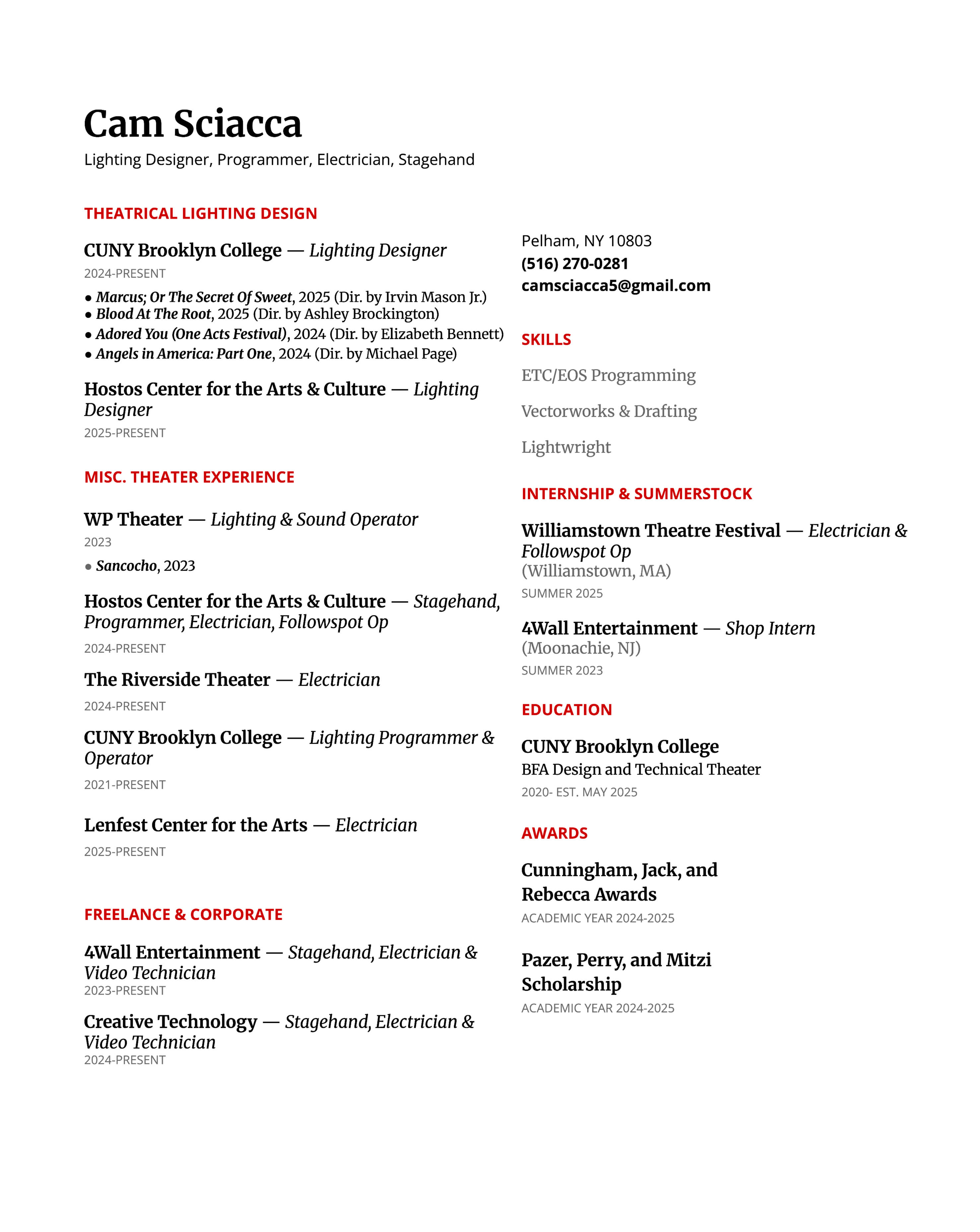 Cam (they/she) is a senior BFA Theater Design and Technical Production student at Brooklyn College with a focus in lighting design.Creatively they are inspired by the relationship between light and shadow, the striking visual language of color, and how lighting can transform the stage into art. Some of their recent design credits include Blood At The Root and Busy Signal. In 2025 they will be spending the summer at Williamstown Theater Festival!